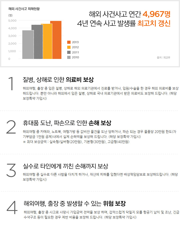 ㆍ여행도중 급격하고 우연한 외래의 사고로 사고일로부터 1년 이내에 사망한 경우 또는 14일 이상 계속 입원한 경우