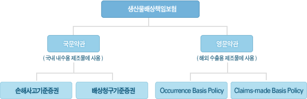 현재 국내에서 판매되고 있는 생산물배상책임보험(PLI)약관은 국문약관과 영문약관이 있으며, 각 약관은 사고담보기준별로 사고발생기준(Occurrence Basis)약관과 배상청구기준(Claims-made Basis)약관으로 구분되어 있습니다.